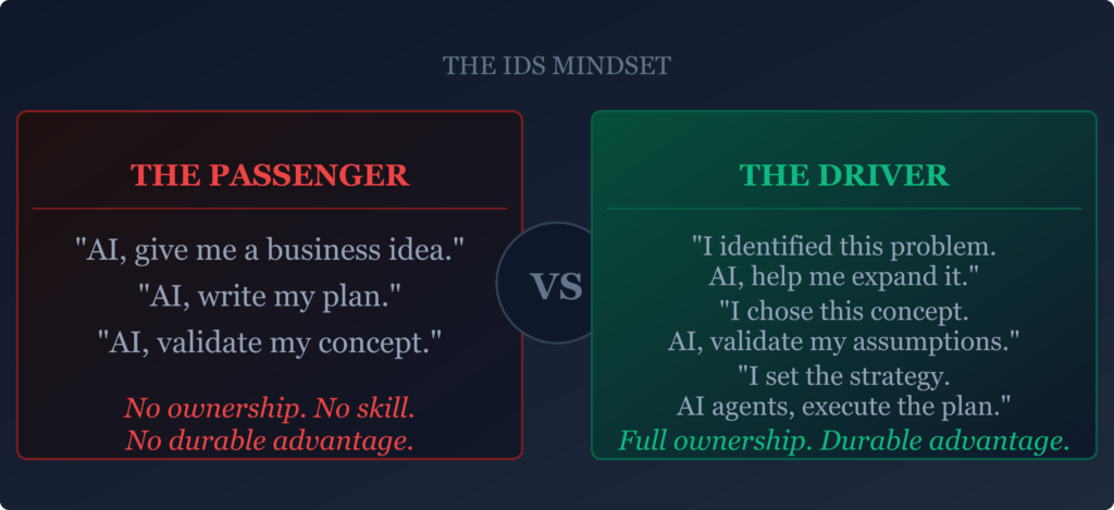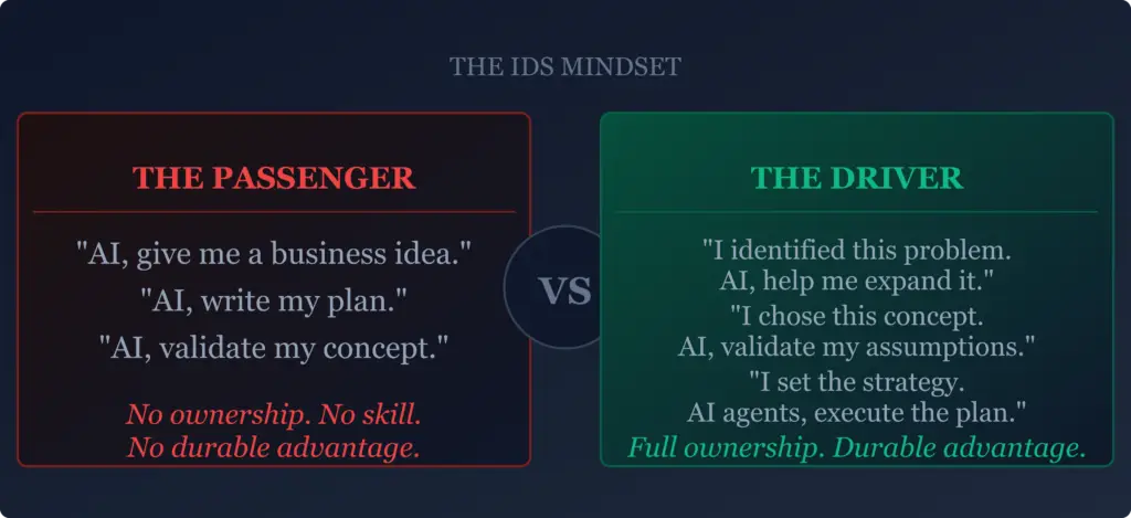 4. Become a passenger — letting AI generate the idea, validate it, and plan it, leaving them with no real ownership of the concept or the skill